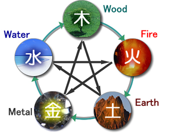 『五行』は五原素の意味です。五元素とは、陰陽ともに宇宙を創設している大自然のエネルギーを『木』、『火』、『土』、『金』、『水』にたとえたものです。この五元素の盛衰関係によって宇宙が循環し発展していくその過程で人間もその影響を受けているという自然哲学の思想です。